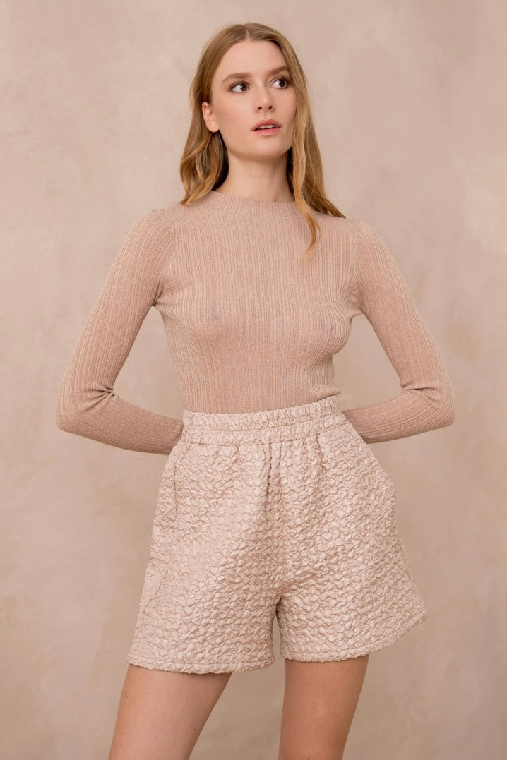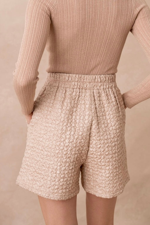The matching high-waisted shorts feature sculpted jacquard with a petal-like texture that adds gentle volume and quiet charm. Wear the set together for soft impact or mix with basics for effortless refinement.