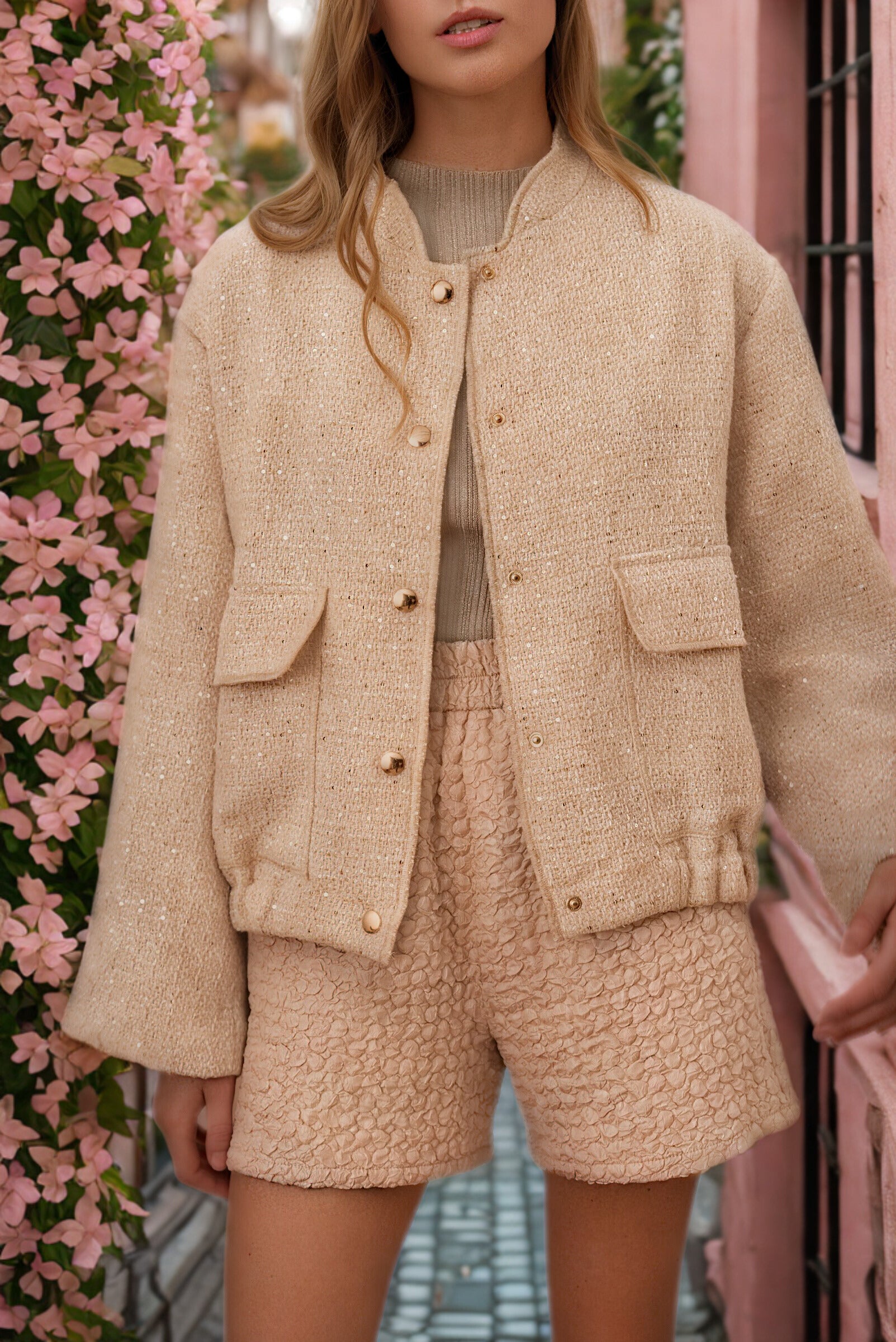 A fresh interpretation of Parisian tailoring, the Lumière Relaxed Shimmer Set blends elegance with ease. The bomber-style jacket is crafted from a softly structured tweed weave, delicately threaded with tonal sequins for a luminous finish. Its oversized, relaxed cut and elasticated hem offer comfort and freedom of movement rarely found in traditional tweed silhouettes.