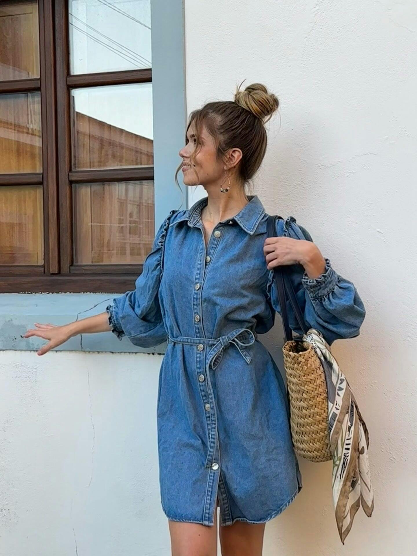 A romantic take on everyday denim, Noëlle blends classic shirting with delicate details. Crafted from 100% cotton, it features soft ruffle accents along the sleeves, voluminous puffed arms, and a removable tie belt to cinch the waist. Finished with buttoned ruffle cuffs, it’s tailored yet tender—ideal for market mornings, brunch dates, and polished afternoons.